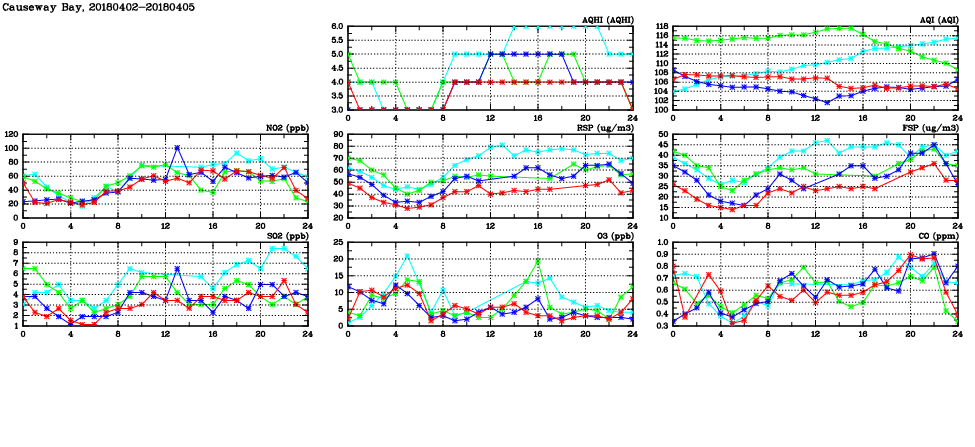 | Air Quality Data Time Series in Causeway Bay (2018/04/05) | ( Line colors: Day -3 Day -2 Day -1 Current day ) | 2D Map Current AQHI |
