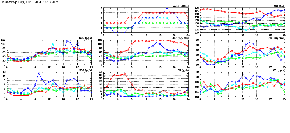 | Air Quality Data Time Series in Causeway Bay (2018/04/07) | ( Line colors: Day -3 Day -2 Day -1 Current day ) | 2D Map Current AQHI |