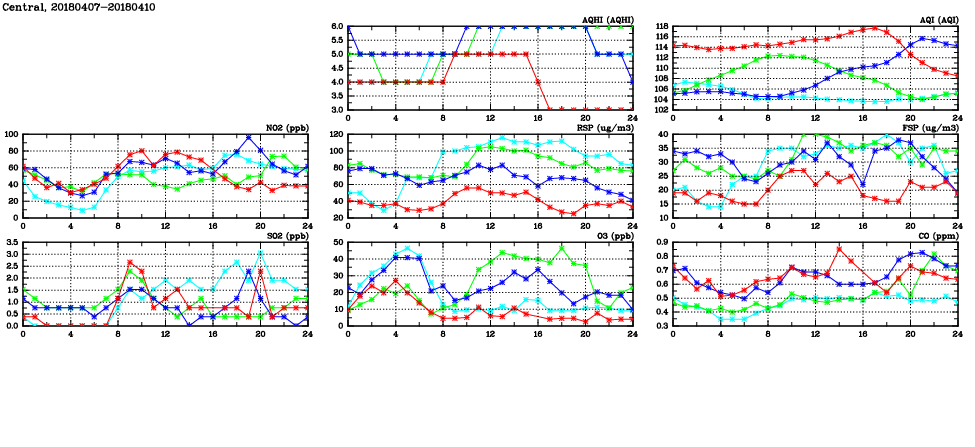 | Air Quality Data Time Series in Central (2018/04/10) | ( Line colors: Day -3 Day -2 Day -1 Current day ) | 2D Map Current AQHI |