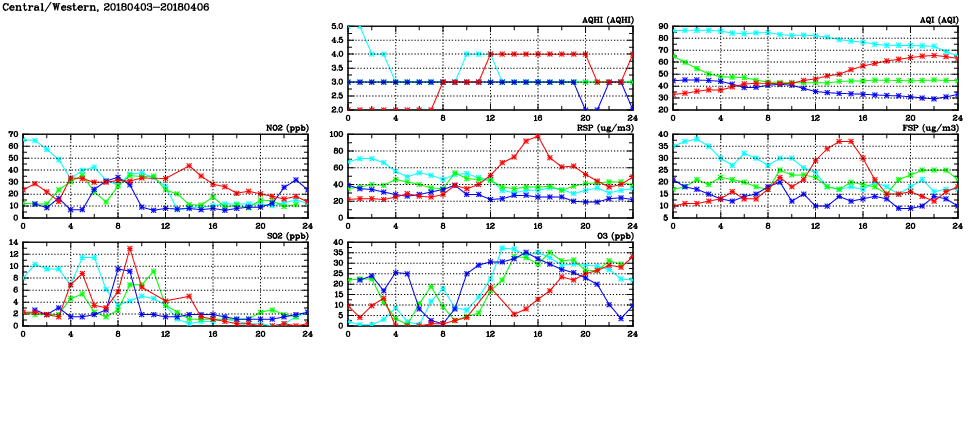 | Air Quality Data Time Series in Central/Western (2018/04/06) | ( Line colors: Day -3 Day -2 Day -1 Current day ) | 2D Map Current AQHI |