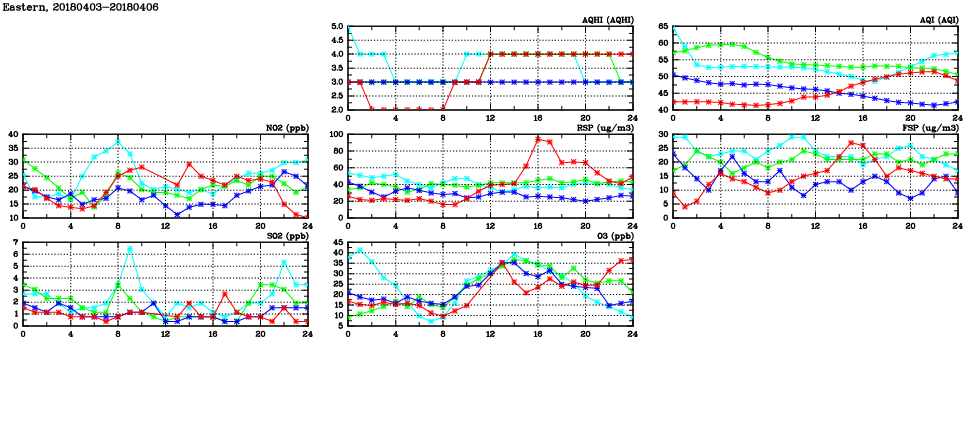 | Air Quality Data Time Series in Eastern (2018/04/06) | ( Line colors: Day -3 Day -2 Day -1 Current day ) | 2D Map Current AQHI |