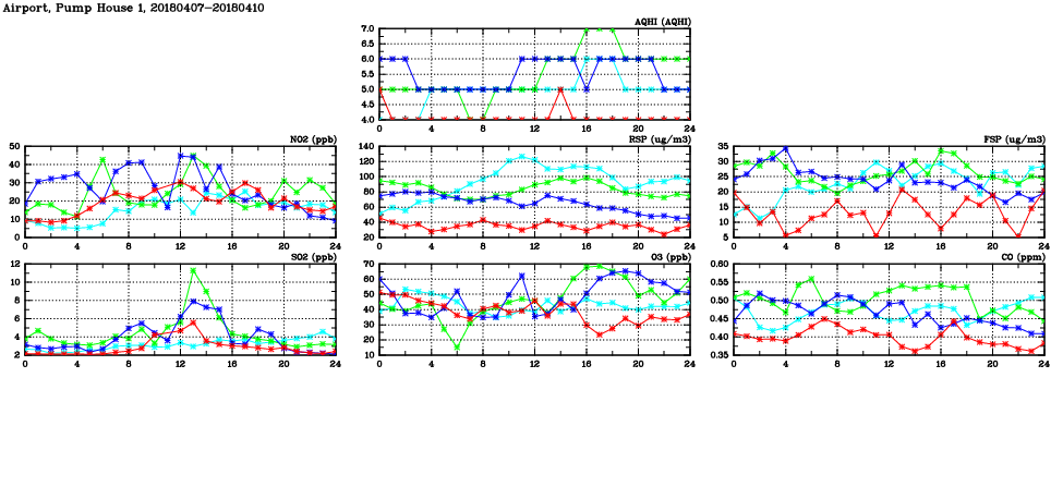 | Air Quality Data Time Series in Airport, Pump House 1 (2018/04/10) | ( Line colors: Day -3 Day -2 Day -1 Current day ) | 2D Map Current AQHI |