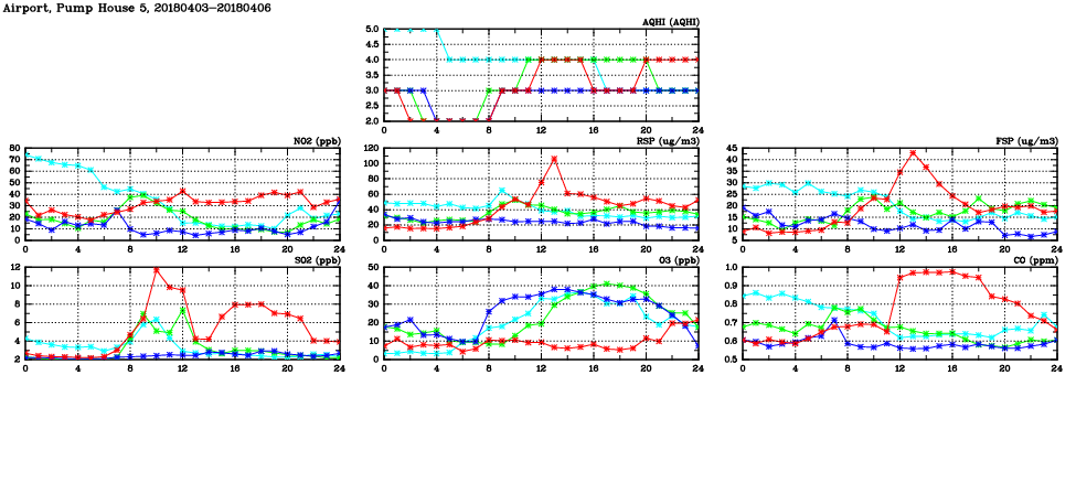 | Air Quality Data Time Series in Airport, Pump House 5 (2018/04/06) | ( Line colors: Day -3 Day -2 Day -1 Current day ) | 2D Map Current AQHI |