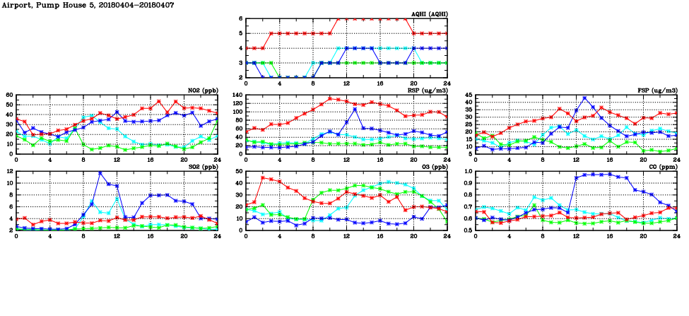 | Air Quality Data Time Series in Airport, Pump House 5 (2018/04/07) | ( Line colors: Day -3 Day -2 Day -1 Current day ) | 2D Map Current AQHI |