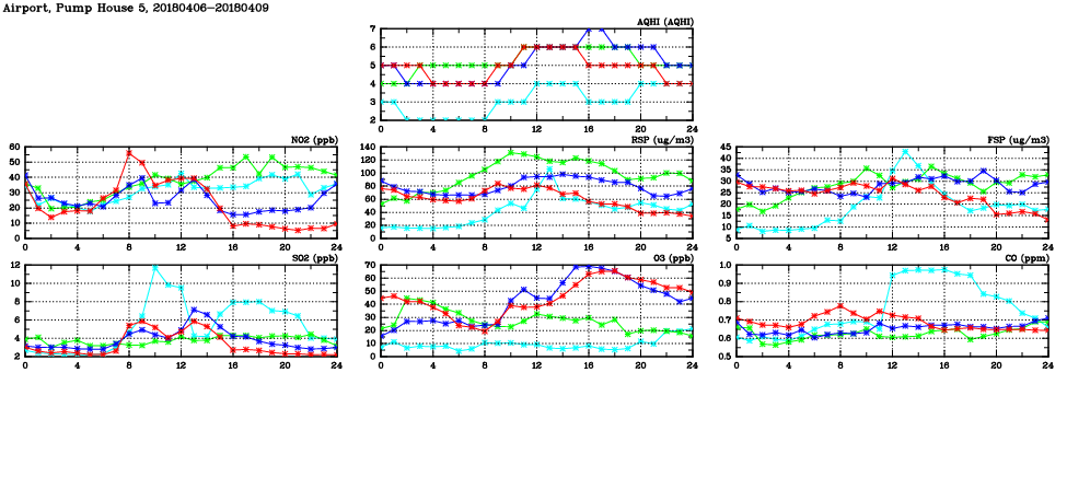 | Air Quality Data Time Series in Airport, Pump House 5 (2018/04/09) | ( Line colors: Day -3 Day -2 Day -1 Current day ) | 2D Map Current AQHI |