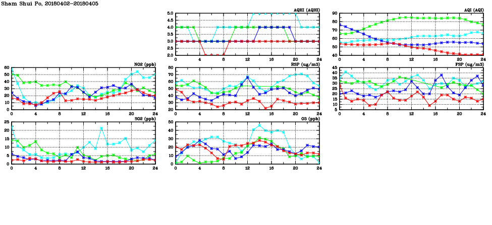 | Air Quality Data Time Series in Sham Shui Po (2018/04/05) | ( Line colors: Day -3 Day -2 Day -1 Current day ) | 2D Map Current AQHI |
