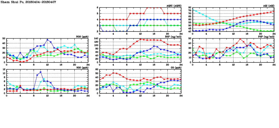 | Air Quality Data Time Series in Sham Shui Po (2018/04/07) | ( Line colors: Day -3 Day -2 Day -1 Current day ) | 2D Map Current AQHI |