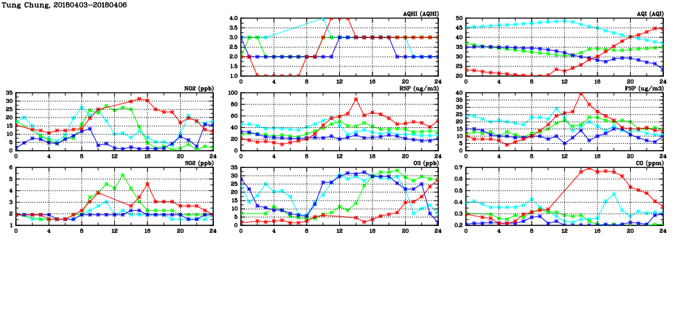 | Air Quality Data Time Series in Tung Chung (2018/04/06) | ( Line colors: Day -3 Day -2 Day -1 Current day ) | 2D Map Current AQHI |