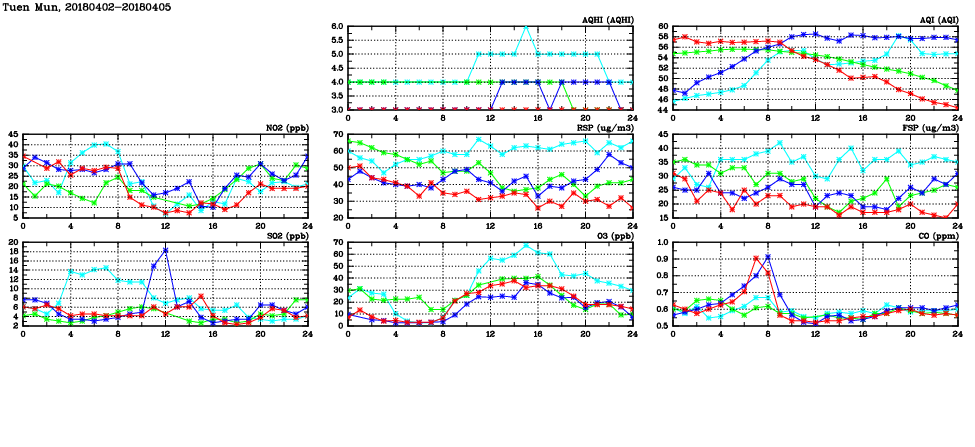 | Air Quality Data Time Series in Tuen Mun (2018/04/05) | ( Line colors: Day -3 Day -2 Day -1 Current day ) | 2D Map Current AQHI |
