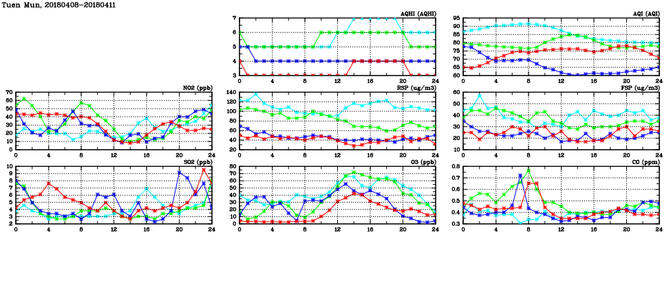 | Air Quality Data Time Series in Tuen Mun (2018/04/11) | ( Line colors: Day -3 Day -2 Day -1 Current day ) | 2D Map Current AQHI |