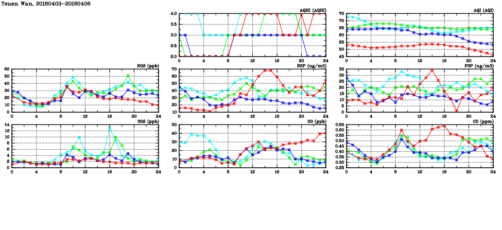 | Air Quality Data Time Series in Tsuen Wan (2018/04/06) | ( Line colors: Day -3 Day -2 Day -1 Current day ) | 2D Map Current AQHI |