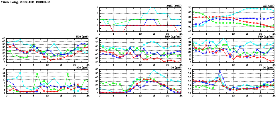 | Air Quality Data Time Series in Yuen Long (2018/04/05) | ( Line colors: Day -3 Day -2 Day -1 Current day ) | 2D Map Current AQHI |