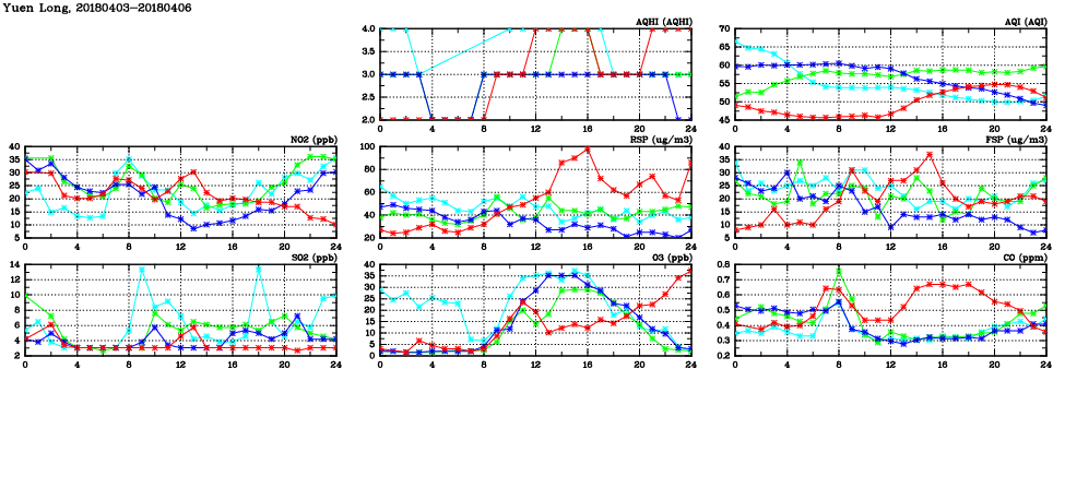 | Air Quality Data Time Series in Yuen Long (2018/04/06) | ( Line colors: Day -3 Day -2 Day -1 Current day ) | 2D Map Current AQHI |