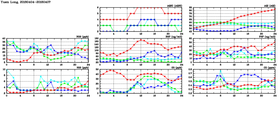 | Air Quality Data Time Series in Yuen Long (2018/04/07) | ( Line colors: Day -3 Day -2 Day -1 Current day ) | 2D Map Current AQHI |