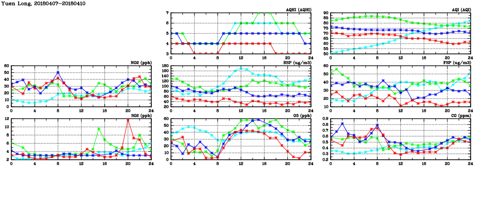| Air Quality Data Time Series in Yuen Long (2018/04/10) | ( Line colors: Day -3 Day -2 Day -1 Current day ) | 2D Map Current AQHI |