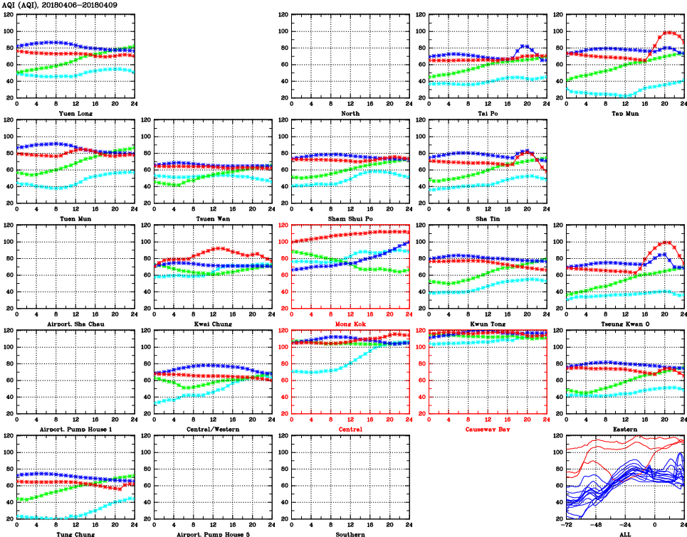 | Air Quality Data Time Series for AQI (2018/04/09) | ( Line colors: Day -3 Day -2 Day -1 Current day ) | 2D Map Current AQHI |