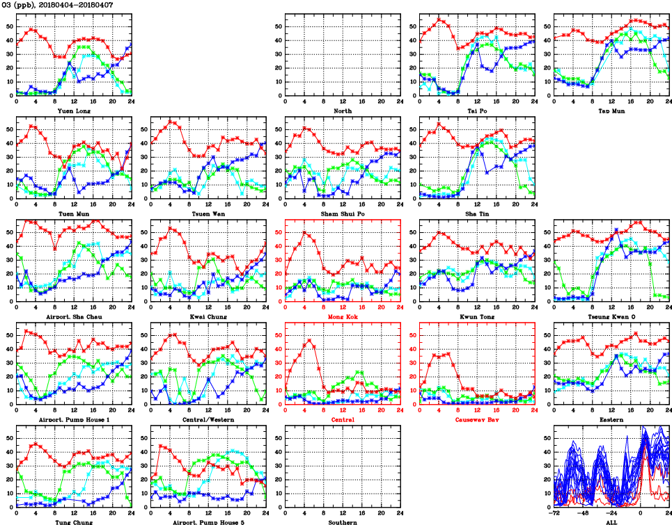 | Air Quality Data Time Series for O3 (2018/04/07) | ( Line colors: Day -3 Day -2 Day -1 Current day ) | 2D Map Current AQHI |