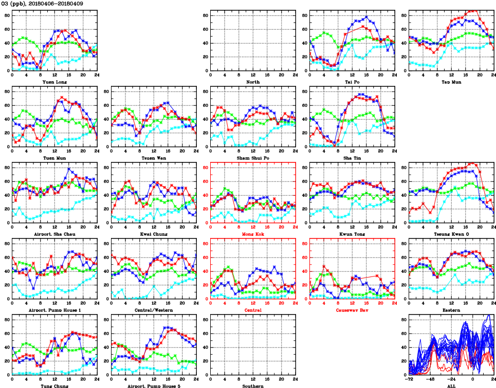 | Air Quality Data Time Series for O3 (2018/04/09) | ( Line colors: Day -3 Day -2 Day -1 Current day ) | 2D Map Current AQHI |