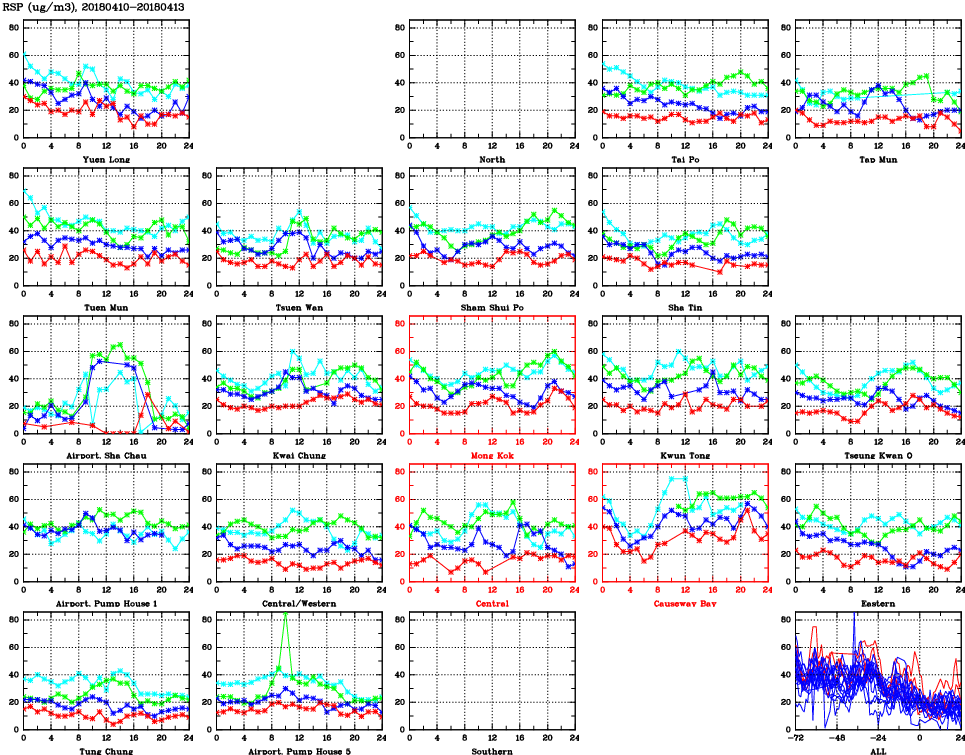 | Air Quality Data Time Series for RSP (2018/04/13) | ( Line colors: Day -3 Day -2 Day -1 Current day ) | 2D Map Current AQHI |