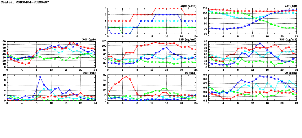 | Air Quality Data Time Series in Central (2018/04/07) | ( Line colors: Day -3 Day -2 Day -1 Current day ) | 2D Map Current AQHI |