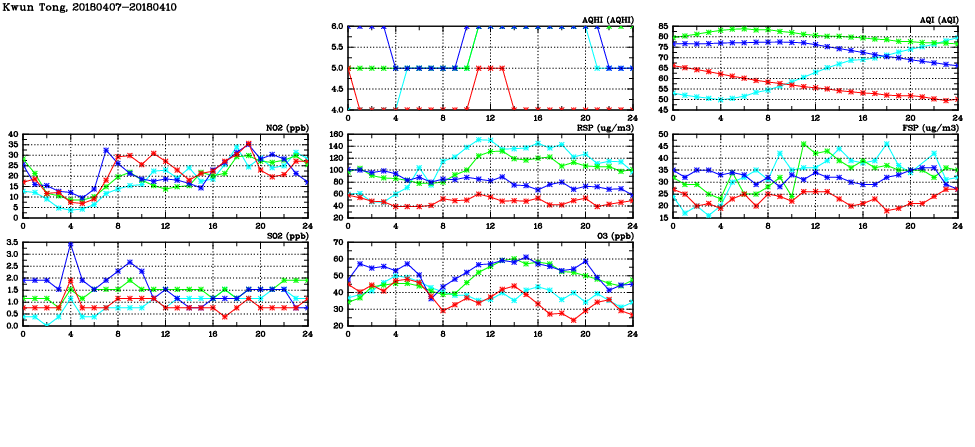 | Air Quality Data Time Series in Kwun Tong (2018/04/10) | ( Line colors: Day -3 Day -2 Day -1 Current day ) | 2D Map Current AQHI |