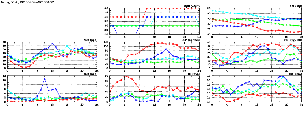 | Air Quality Data Time Series in Mong Kok (2018/04/07) | ( Line colors: Day -3 Day -2 Day -1 Current day ) | 2D Map Current AQHI |