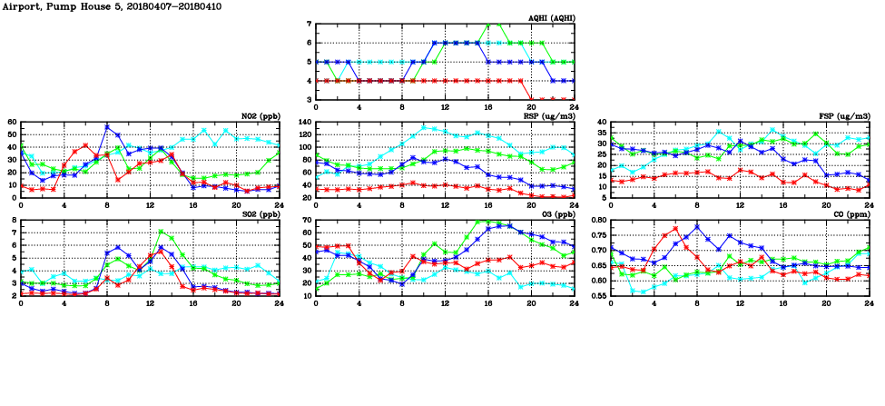 | Air Quality Data Time Series in Airport, Pump House 5 (2018/04/10) | ( Line colors: Day -3 Day -2 Day -1 Current day ) | 2D Map Current AQHI |