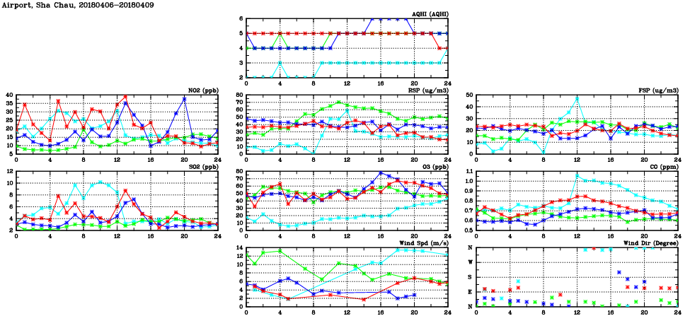 | Air Quality Data Time Series in Airport, Sha Chau (2018/04/09) | ( Line colors: Day -3 Day -2 Day -1 Current day ) | 2D Map Current AQHI |
