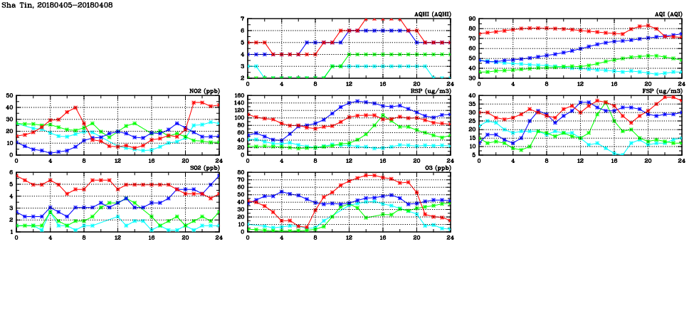 | Air Quality Data Time Series in Sha Tin (2018/04/08) | ( Line colors: Day -3 Day -2 Day -1 Current day ) | 2D Map Current AQHI |