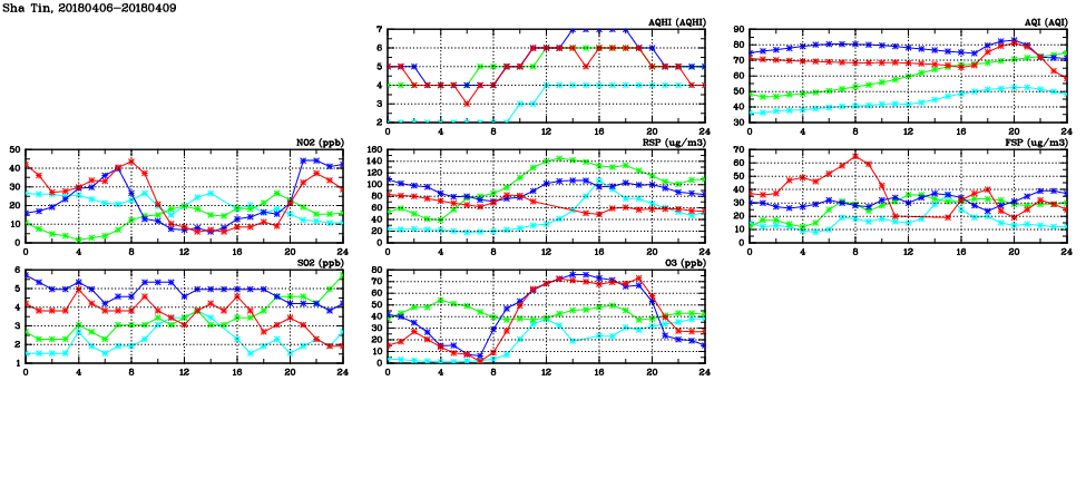 | Air Quality Data Time Series in Sha Tin (2018/04/09) | ( Line colors: Day -3 Day -2 Day -1 Current day ) | 2D Map Current AQHI |