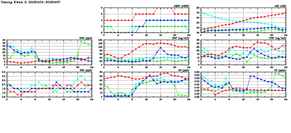 | Air Quality Data Time Series in Tseung Kwan O (2018/04/07) | ( Line colors: Day -3 Day -2 Day -1 Current day ) | 2D Map Current AQHI |