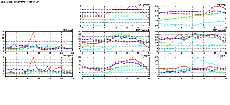 | Air Quality Data Time Series in Tap Mun (2018/04/09) | ( Line colors: Day -3 Day -2 Day -1 Current day ) | 2D Map Current AQHI |