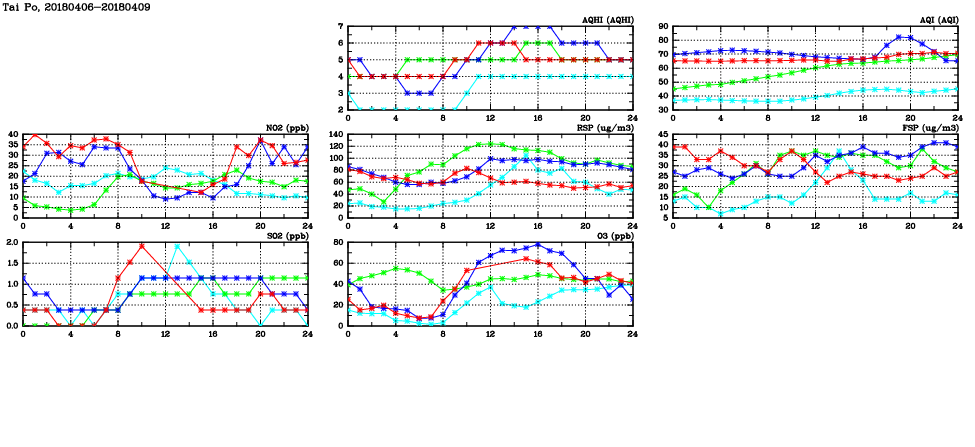 | Air Quality Data Time Series in Tai Po (2018/04/09) | ( Line colors: Day -3 Day -2 Day -1 Current day ) | 2D Map Current AQHI |