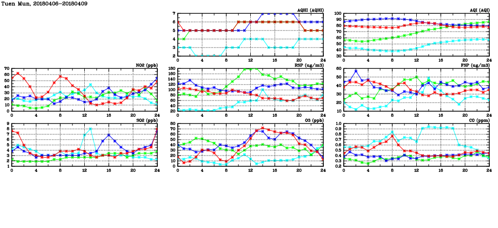 | Air Quality Data Time Series in Tuen Mun (2018/04/09) | ( Line colors: Day -3 Day -2 Day -1 Current day ) | 2D Map Current AQHI |