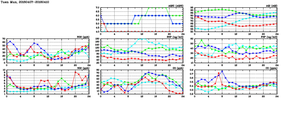 | Air Quality Data Time Series in Tuen Mun (2018/04/10) | ( Line colors: Day -3 Day -2 Day -1 Current day ) | 2D Map Current AQHI |