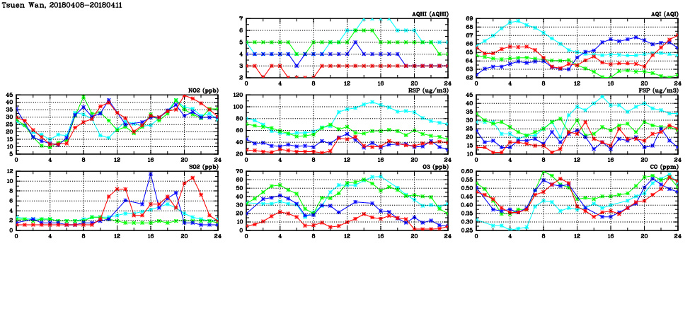 | Air Quality Data Time Series in Tsuen Wan (2018/04/11) | ( Line colors: Day -3 Day -2 Day -1 Current day ) | 2D Map Current AQHI |