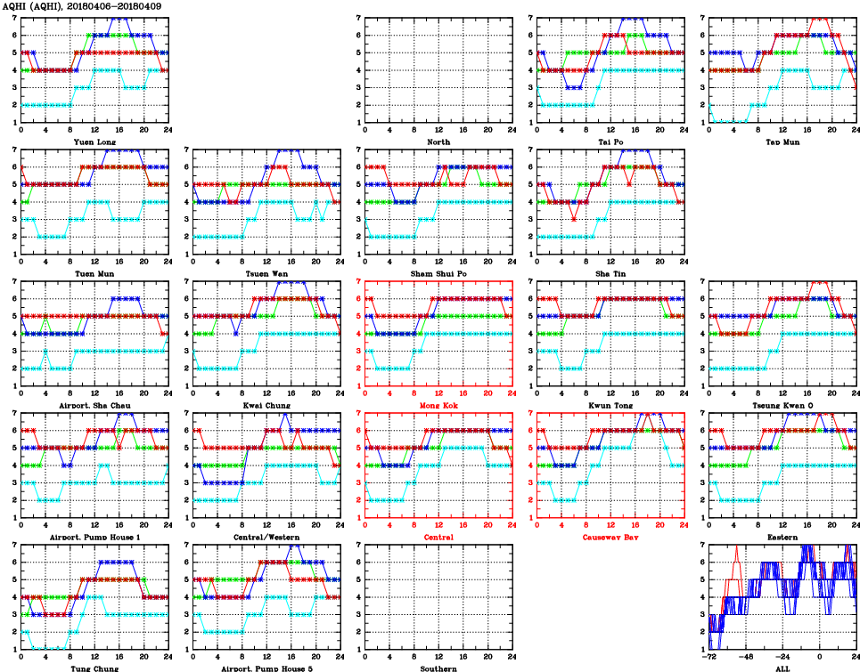 | Air Quality Data Time Series for AQHI (2018/04/09) | ( Line colors: Day -3 Day -2 Day -1 Current day ) | 2D Map Current AQHI |