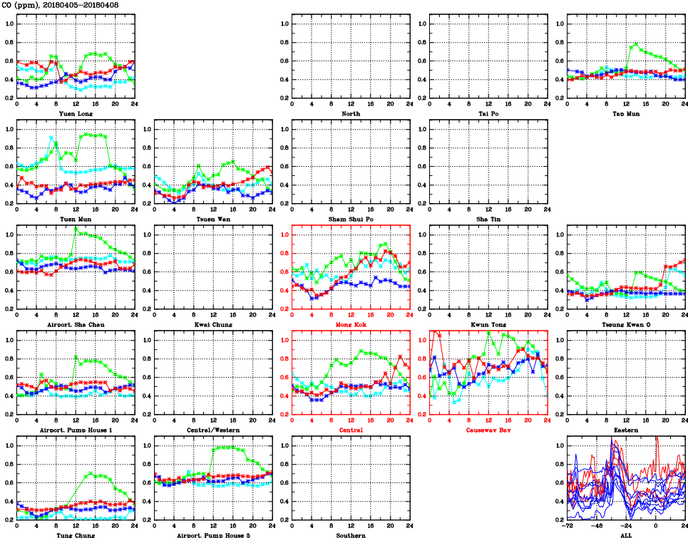 | Air Quality Data Time Series for CO (2018/04/08) | ( Line colors: Day -3 Day -2 Day -1 Current day ) | 2D Map Current AQHI |