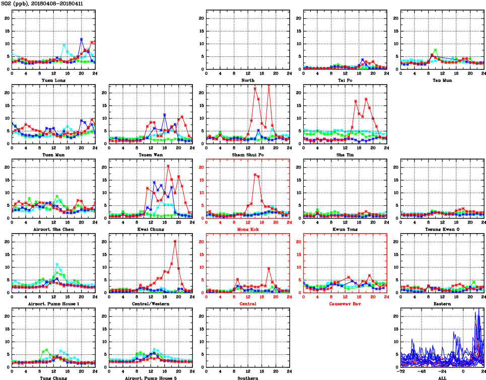 | Air Quality Data Time Series for SO2 (2018/04/11) | ( Line colors: Day -3 Day -2 Day -1 Current day ) | 2D Map Current AQHI |