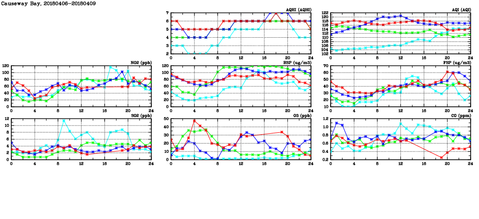 | Air Quality Data Time Series in Causeway Bay (2018/04/09) | ( Line colors: Day -3 Day -2 Day -1 Current day ) | 2D Map Current AQHI |