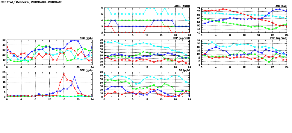 | Air Quality Data Time Series in Central/Western (2018/04/12) | ( Line colors: Day -3 Day -2 Day -1 Current day ) | 2D Map Current AQHI |