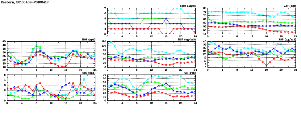 | Air Quality Data Time Series in Eastern (2018/04/12) | ( Line colors: Day -3 Day -2 Day -1 Current day ) | 2D Map Current AQHI |