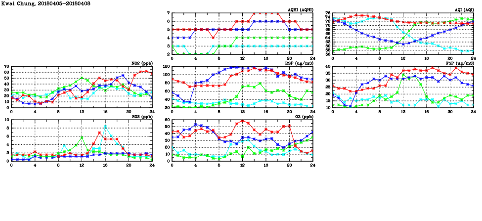 | Air Quality Data Time Series in Kwai Chung (2018/04/08) | ( Line colors: Day -3 Day -2 Day -1 Current day ) | 2D Map Current AQHI |