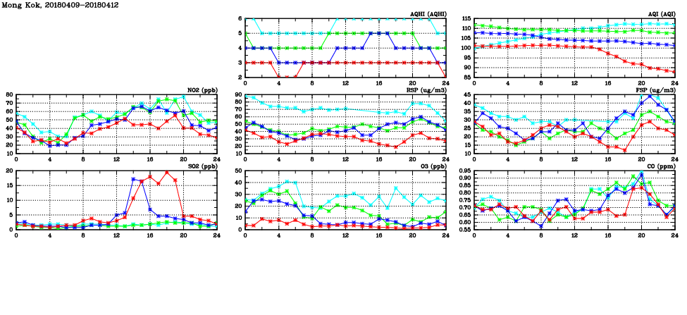 | Air Quality Data Time Series in Mong Kok (2018/04/12) | ( Line colors: Day -3 Day -2 Day -1 Current day ) | 2D Map Current AQHI |