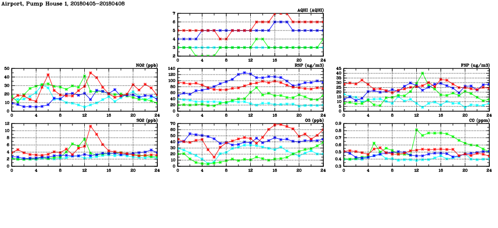 | Air Quality Data Time Series in Airport, Pump House 1 (2018/04/08) | ( Line colors: Day -3 Day -2 Day -1 Current day ) | 2D Map Current AQHI |