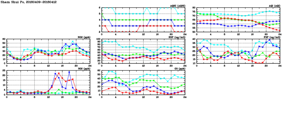 | Air Quality Data Time Series in Sham Shui Po (2018/04/12) | ( Line colors: Day -3 Day -2 Day -1 Current day ) | 2D Map Current AQHI |