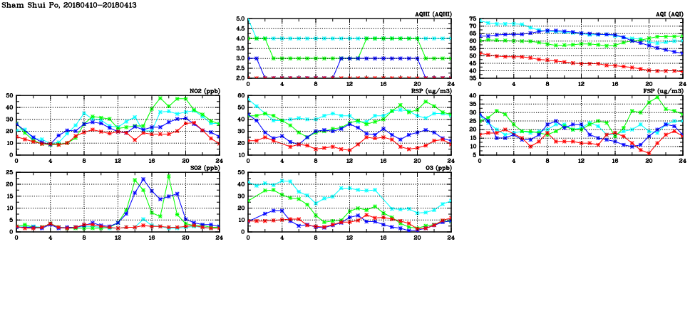 | Air Quality Data Time Series in Sham Shui Po (2018/04/13) | ( Line colors: Day -3 Day -2 Day -1 Current day ) | 2D Map Current AQHI |