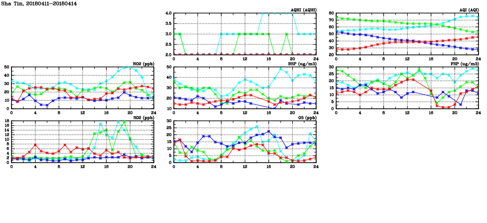 | Air Quality Data Time Series in Sha Tin (2018/04/14) | ( Line colors: Day -3 Day -2 Day -1 Current day ) | 2D Map Current AQHI |