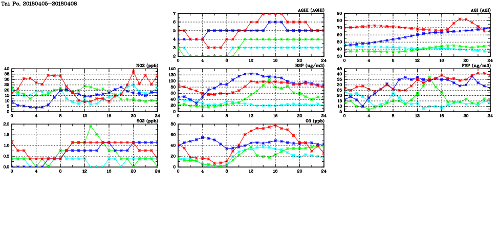 | Air Quality Data Time Series in Tai Po (2018/04/08) | ( Line colors: Day -3 Day -2 Day -1 Current day ) | 2D Map Current AQHI |