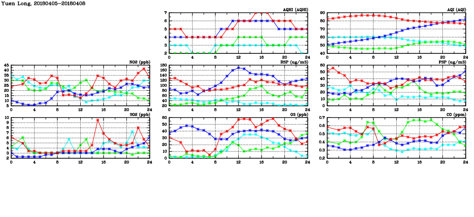 | Air Quality Data Time Series in Yuen Long (2018/04/08) | ( Line colors: Day -3 Day -2 Day -1 Current day ) | 2D Map Current AQHI |